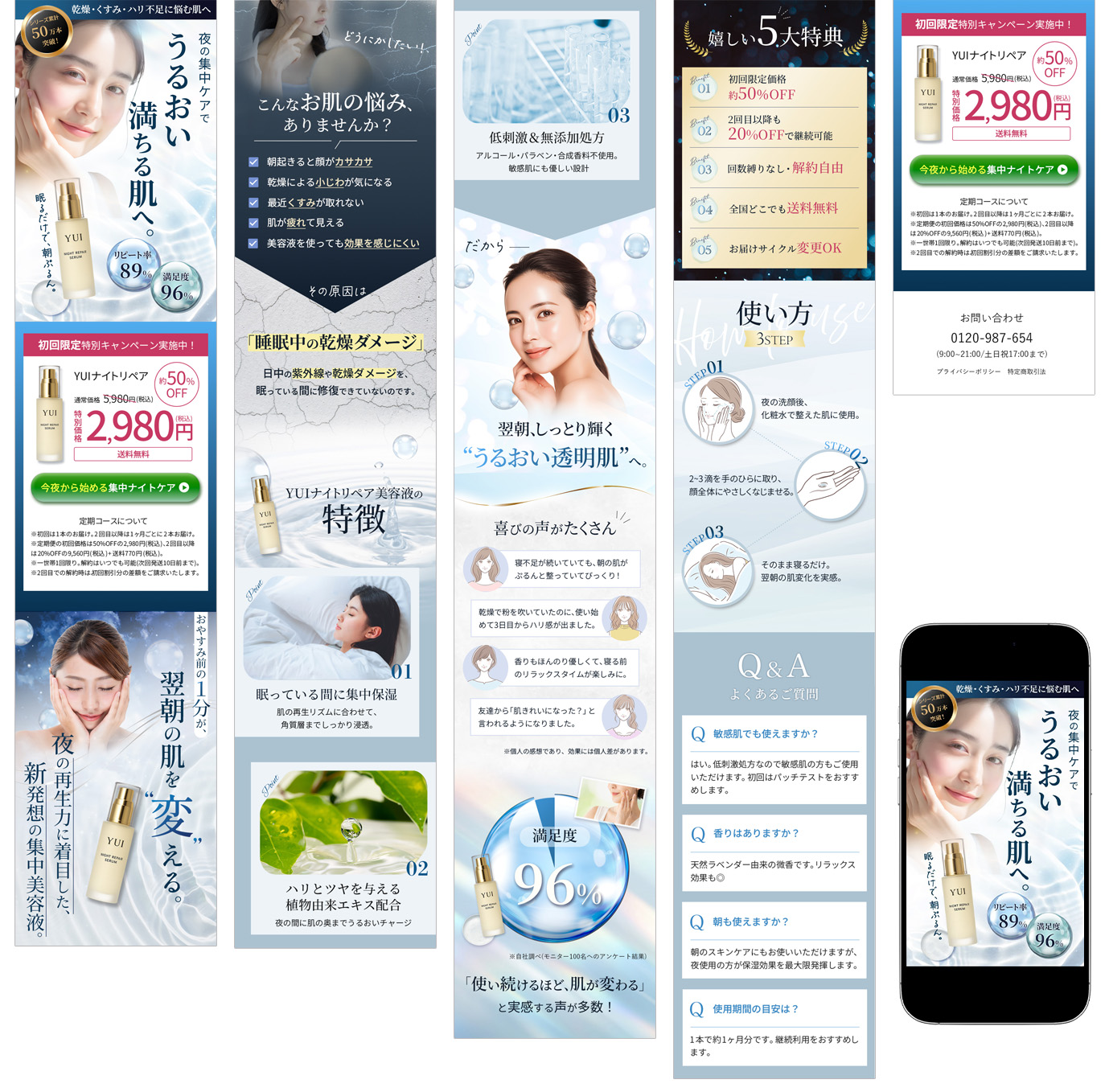 美容液のLPを作成しました。潤いを表現するため淡いブルーをベースカラーに、夜に使用するためネイビーをメインカラーとして製作しました。メインに水の素材を多く使い透明感のある女性好みの雰囲気に仕上げました。